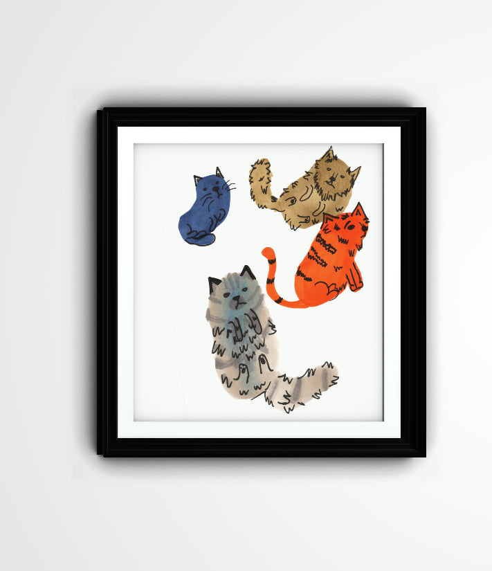 Perfect for cat lovers, art enthusiasts, or anyone who enjoys unique decor, this print is based on an original illustration using ink and watercolor-style markers. Each cat has its own distinctive expression, making this piece both endearing and eye-catching.