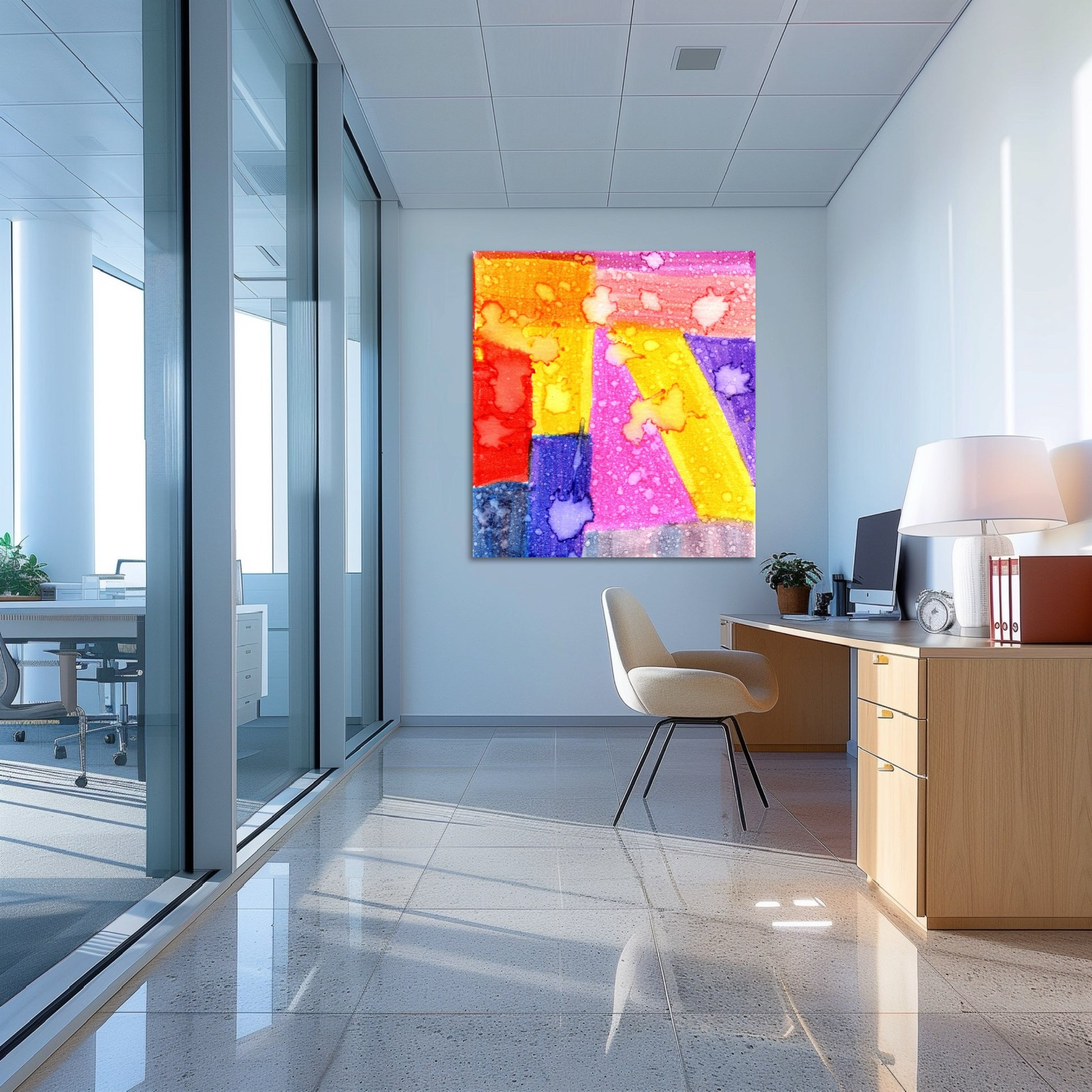 Add a bold splash of color to your walls with this vibrant abstract watercolor art print, inspired by geometric shapes and expressive color blocking. Featuring rich shades of red, yellow, purple, and pink with soft watercolor textures and organic patterns, this piece is perfect for modern interiors that crave personality and warmth.