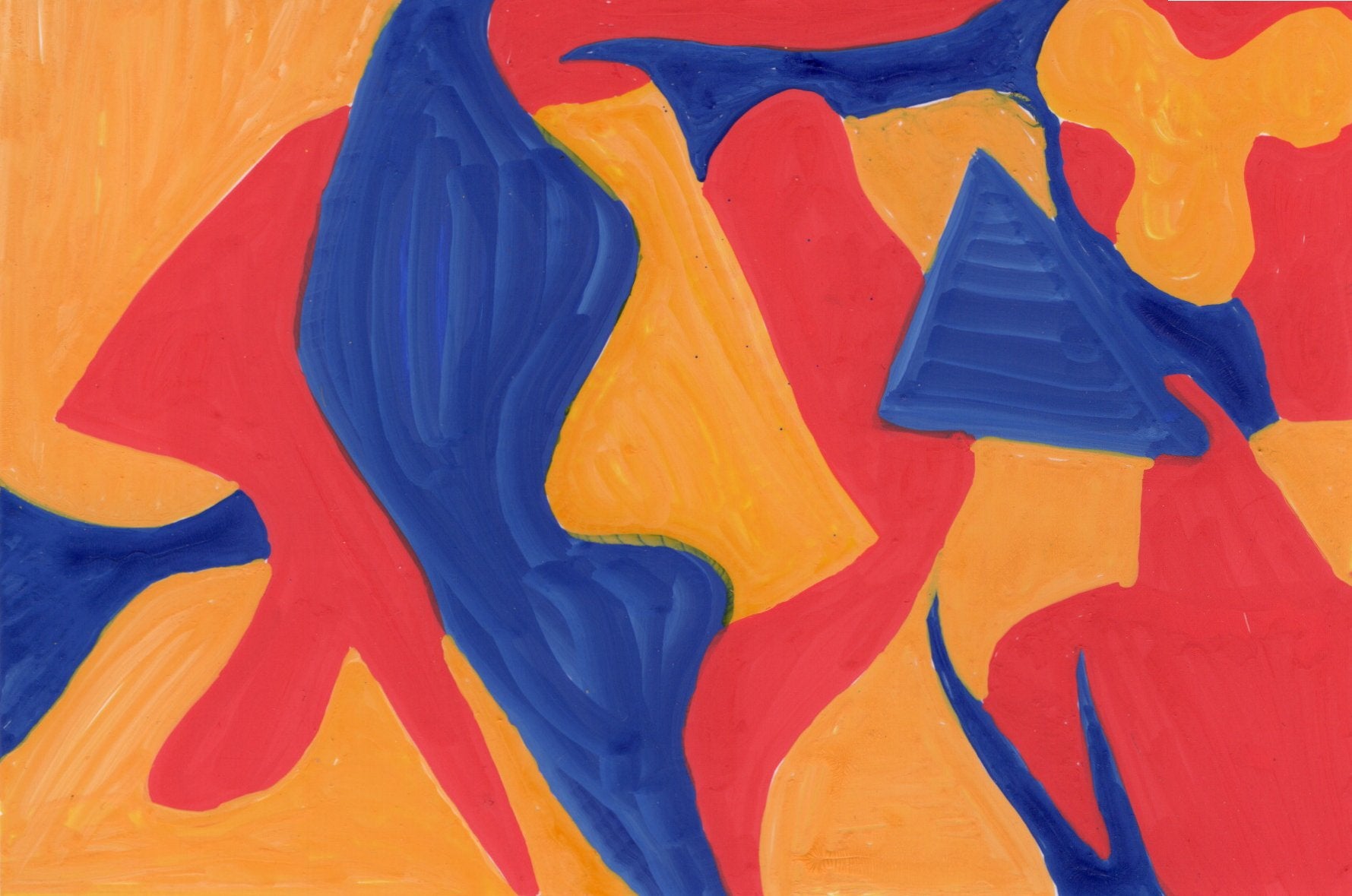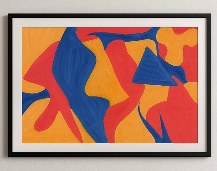 Bring vibrant energy into your space with this original abstract acrylic painting, featuring bold geometric shapes in rich red, deep blue, and warm yellow tones. This eye-catching modern artwork blends organic and angular forms in a dynamic composition, perfect for lovers of abstract expressionism and mid-century modern aesthetics.