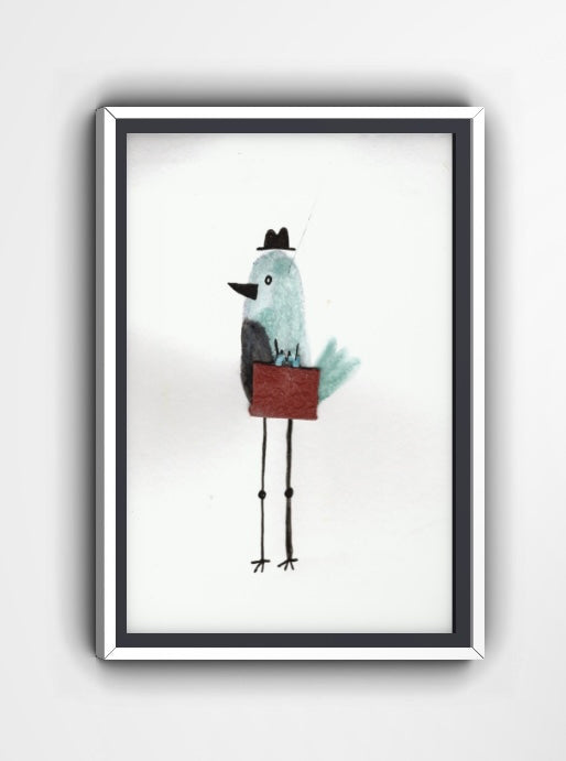 Add a little workplace whimsy to your walls with “Early Bird Gets the Briefcase,” a playful watercolor and ink illustration by Nate. This charming bird, complete with a tiny hat and business briefcase, is ready to take on the day—one chirp at a time.