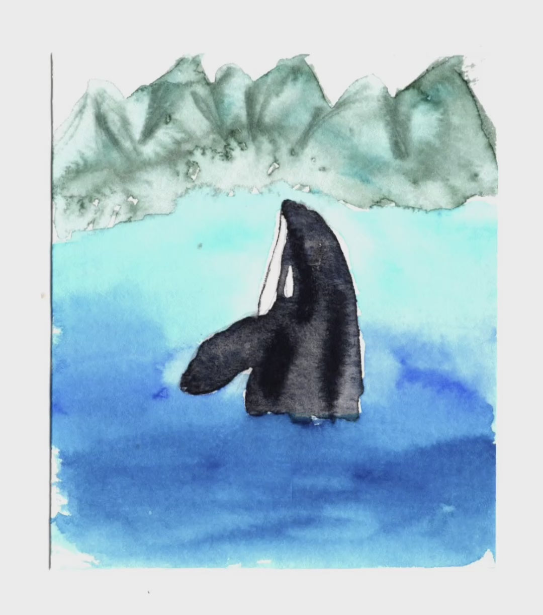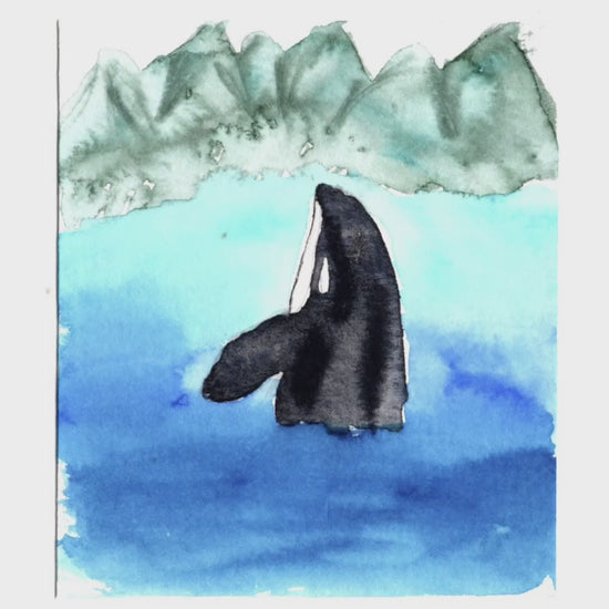 Bring the beauty of marine life into your home with this stunning Orca watercolor art print. Featuring a killer whale rising from tranquil ocean waters, set against a soft mountain backdrop, this painting captures the magic and serenity of the natural world.