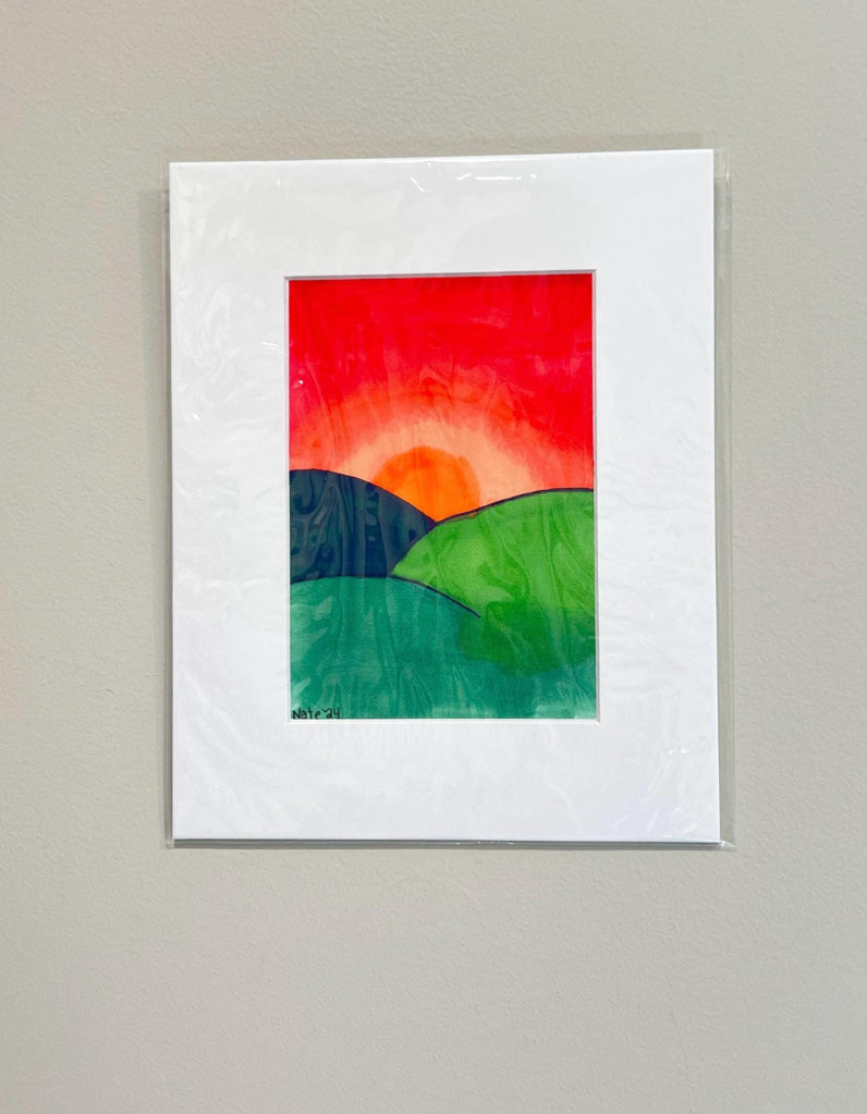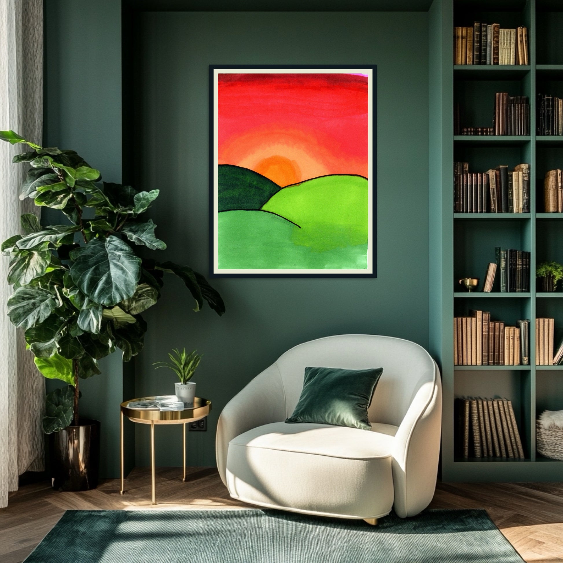 Add a pop of color and warmth to your space with this Bold Sunset Hills art print. Featuring rolling green hills, a glowing orange sun, and a rich red sky, this vibrant landscape captures the beauty of nature in a playful, modern style.
